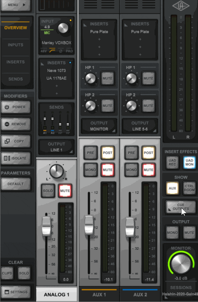 ルーティングはApolloのメイン出力を配信に使い、ボーカルやカラオケの信号を別チャンネルに分けて配信者用のアナログミキサーに送ります。ボーカルレコーディングのルーティングとだいたい同じです。